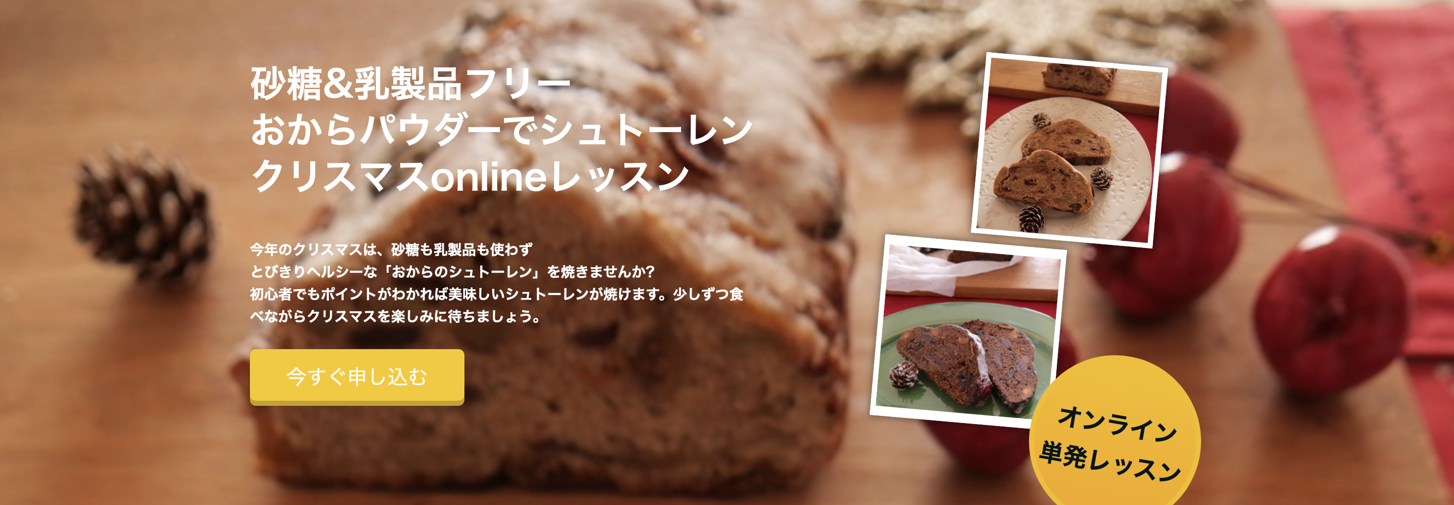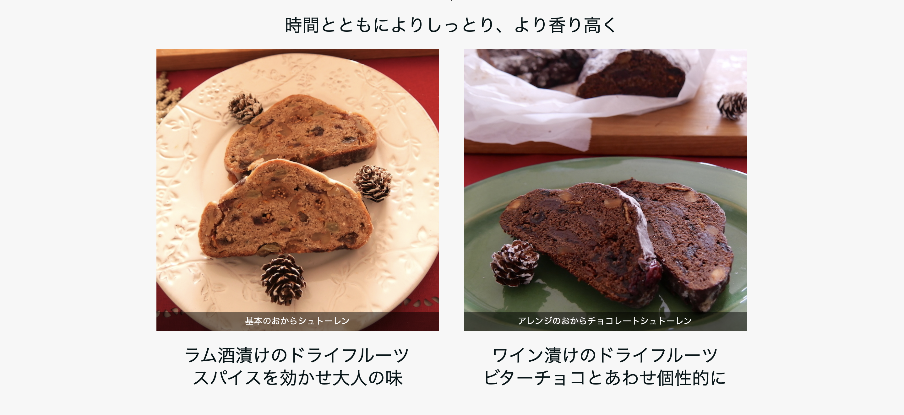 ひとつはスパイスを効かせたドイツ風「基本のシュトーレン」。もうひとつは「おからチョコレートシュトーレン」。通常日持ちしにくいおからケーキですが、お日持ちするレシピです。少しずつ食べながら、今年はクリスマスを楽しみに待ちませんか?